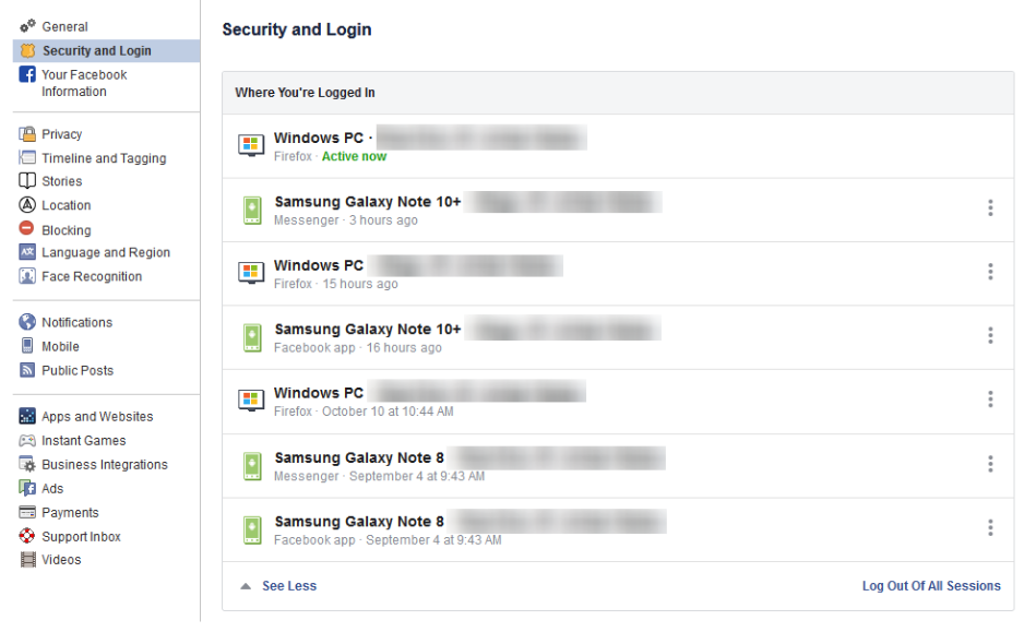 On this screen, you can see all the devices your Facebook account is currently signed into. You will be confused why there are so many, but think about it: how long have you been using Facebook? For many people it’s not out of line to suggest that they are on their fourth or fifth phone since first using the Facebook app. This means that these devices will show up. You don’t use a Nokia Lumia 920 any longer? Not many people do. Facebook gives you the option to sign out of any of these devices by accessing the three-dot icon next to the device’s name.