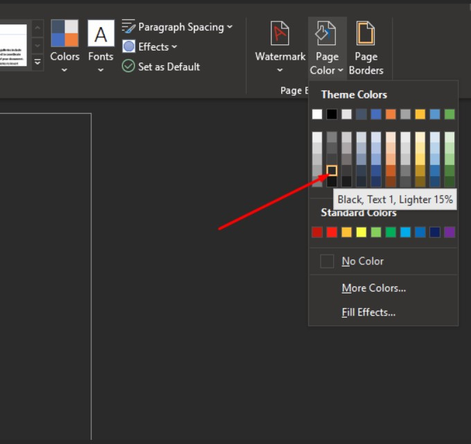 From there, choose one of the darker colors. You’ll notice your document will change as you hover over the different color options. The lower values tend to make the text light. I usually choose the second option from the bottom in the second column, as indicated above.
